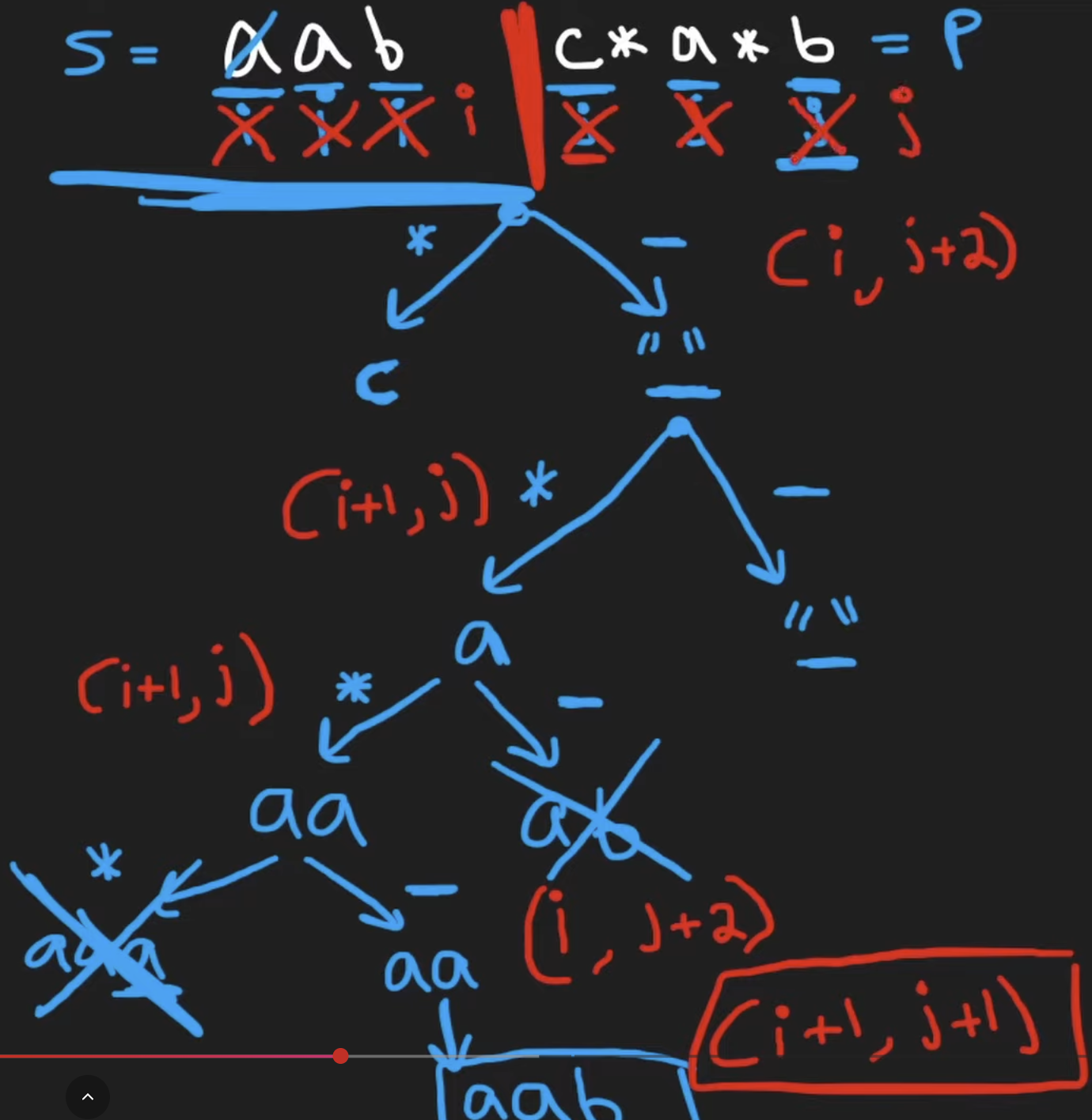 *(and precedent char matches), this means that we have found a match by repeating the precedent char, then(i, j) -> (i + 1, j),jremains the same since we could use the*again - if we do not use the