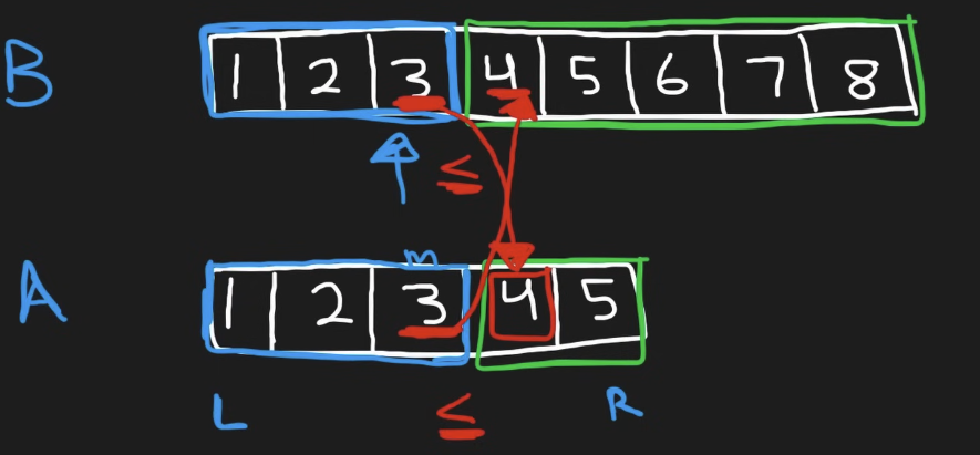 The main idea is to run binary search on the shorter list to deduce the required index of the cut off point in the longer list. The two list A and B (A is the shorter one) are given and we start with A where we assume the left part of the list belongs to the left part of the combined list. In the picture below there are total 13 numbers so there should be 6 numbers in the left portion (if we want to calculate the median, we need to figure out the middle point in the combined sorted array), so this leave us 6-3=3 numbers to be found in array B. We then check the boundary Aleft (in A, blue 3), Aright (in A, green 4), Bleft (in B, blue 3), Bright (in B, green 4) which are the 4 index in the A/B arrays to see if the condition is satisfied: Aleft < Bright and Bleft < Aright, if this is satisfied then we found the boundary of the middle point in the combined list. if not we need to do binary search to move the m , 0 -> m is the subarray that will be in the final left portion and the in each search the subarray B will be adjusted accordingly and the boundary conditions (Aleft < Bright and Bleft < Aright) will be checked.