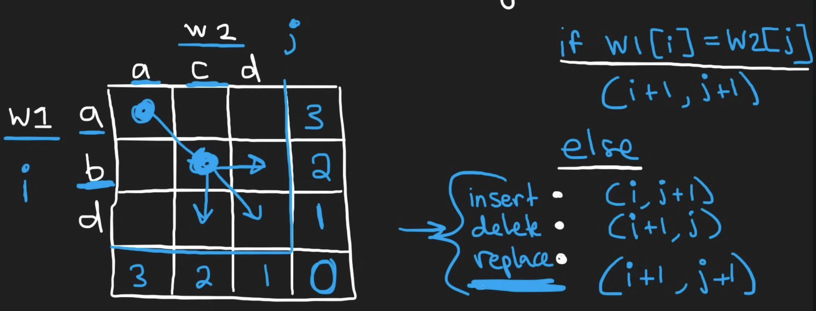 word1[i] == word2[j]then we just take the diagonal bottom right - else we will take look at the 3 squares and find the minimum of these and add one operation on top of it.