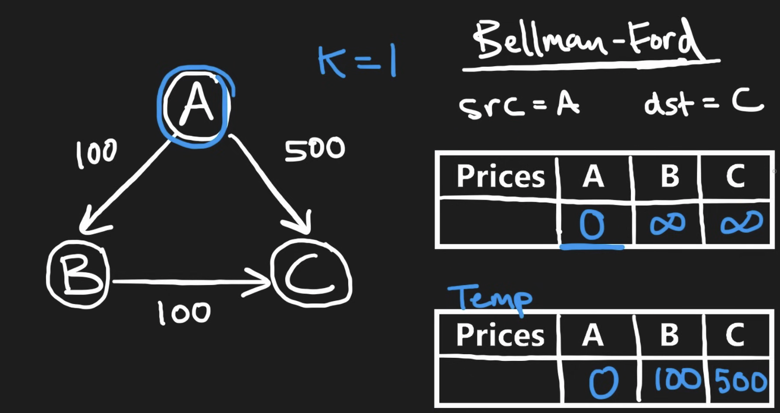 This question can be solved with Bellman-Ford algorithm which similar to Dijkstra’s algorithm, can find the minimum distance between two nodes. This algo is usually slower but can handle negative edges and also handle restrictions such as maximum of k hopping. The key idea of this algo is to do a BFS-style of traverse on ALL the edges at the same time. Each node’s cost starts at infinity except the starting node, which is 0. We total perform k + 1 iteration (since we can make k jump) iterations, at each iteration: