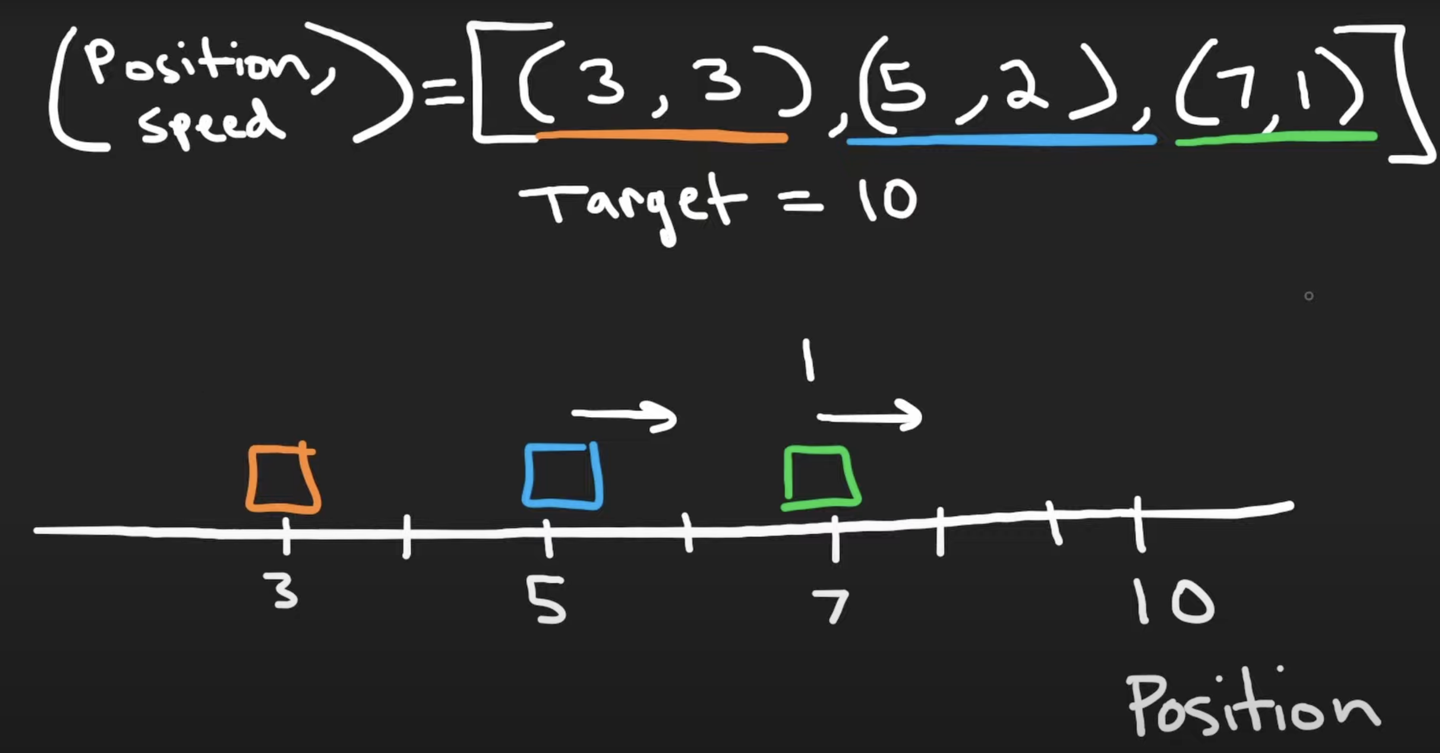 - The cars starting at 5 (speed 1) and 3 (speed 3) become a fleet, meeting each other at 6. The fleet moves at speed 1 until it reaches