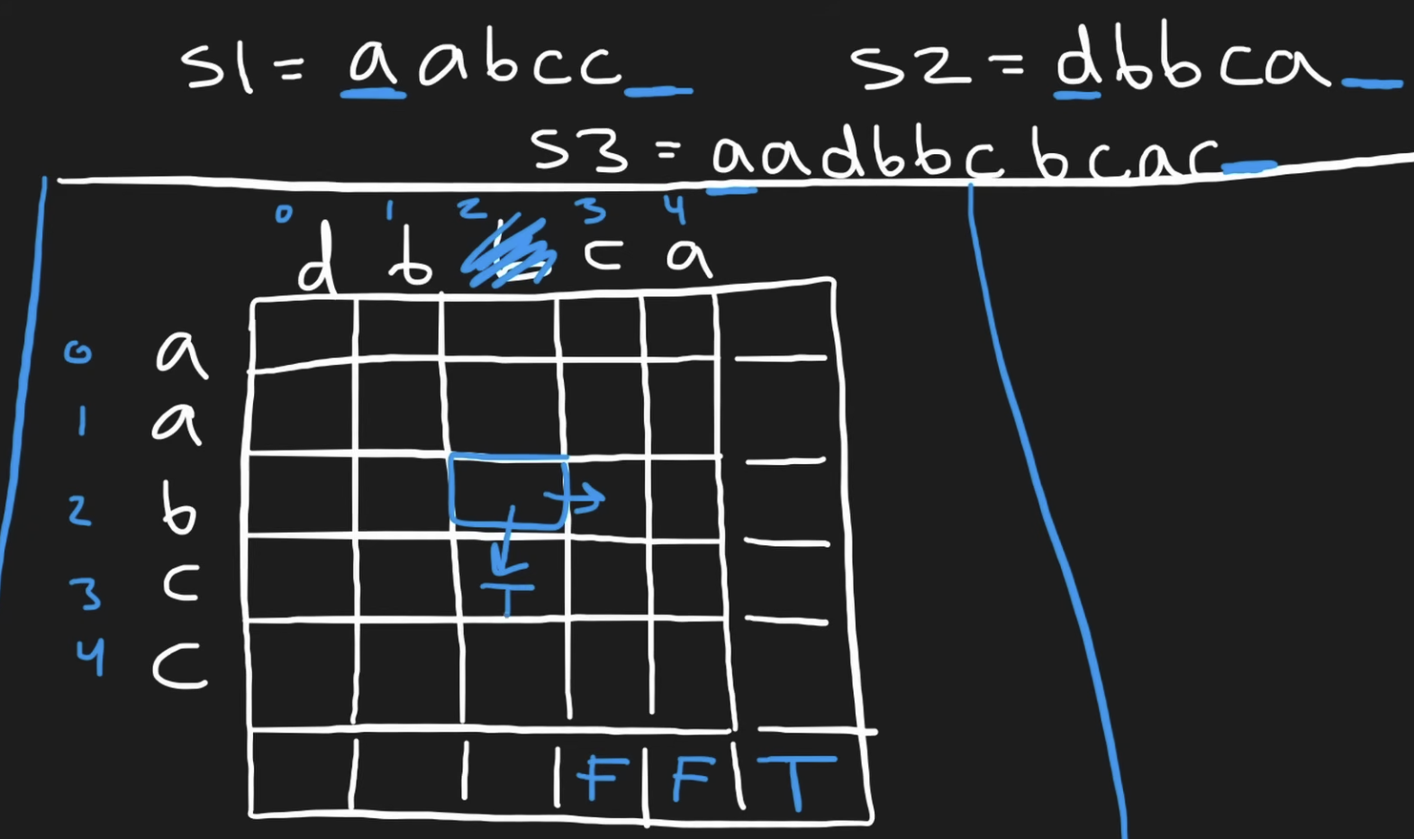if i < len(s1) and s1[i] == s3[i + j] and dp[i + 1][j]: